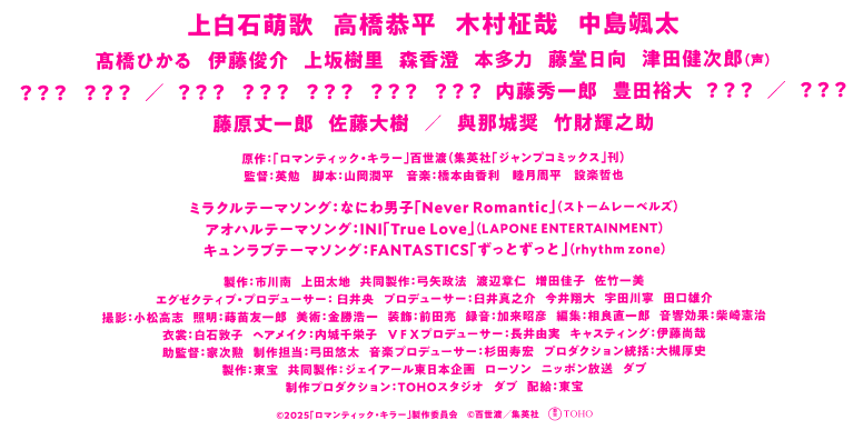 本作を彩る追加キャストとして、上白石萌歌演じる星野杏子に絶対恋してもらいたい魔法使い・伏木リリ役に髙橋ひかる、魔法使い・リリの声優を務める伊藤俊介(オズワルド)、杏子の友人・高峯咲姫役に上坂樹里、謎の女・岸優花菜役に森香澄、杏子のクラスの冴えない担任役に本多力、杏子のバイト先のバイトリーダー・コンビニ沢田役に藤堂日向、本作の語りと魔法界の主審の声優を務める津田健次郎、杏子に迫りくる新たな≪ロマンティック男子≫として、謎の秀才男子役に内藤秀一郎、謎の自転車男子役に豊田裕大、小金井聖の執事・土屋役に竹財輝之助の出演が決定しました!個性豊かなキャスト陣が、いったいどのようなロマンティックを生み出してくれるのか…。≪ロマンティック男子≫が集結!ハチャメチャ感満載な新ポスタービジュアルも解禁となりました!